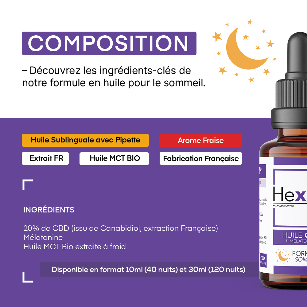 • Les + produit : Synergie CBD + mélatonine – Déclarée et Autorisée en France – Made in France – 40 nuits paisibles